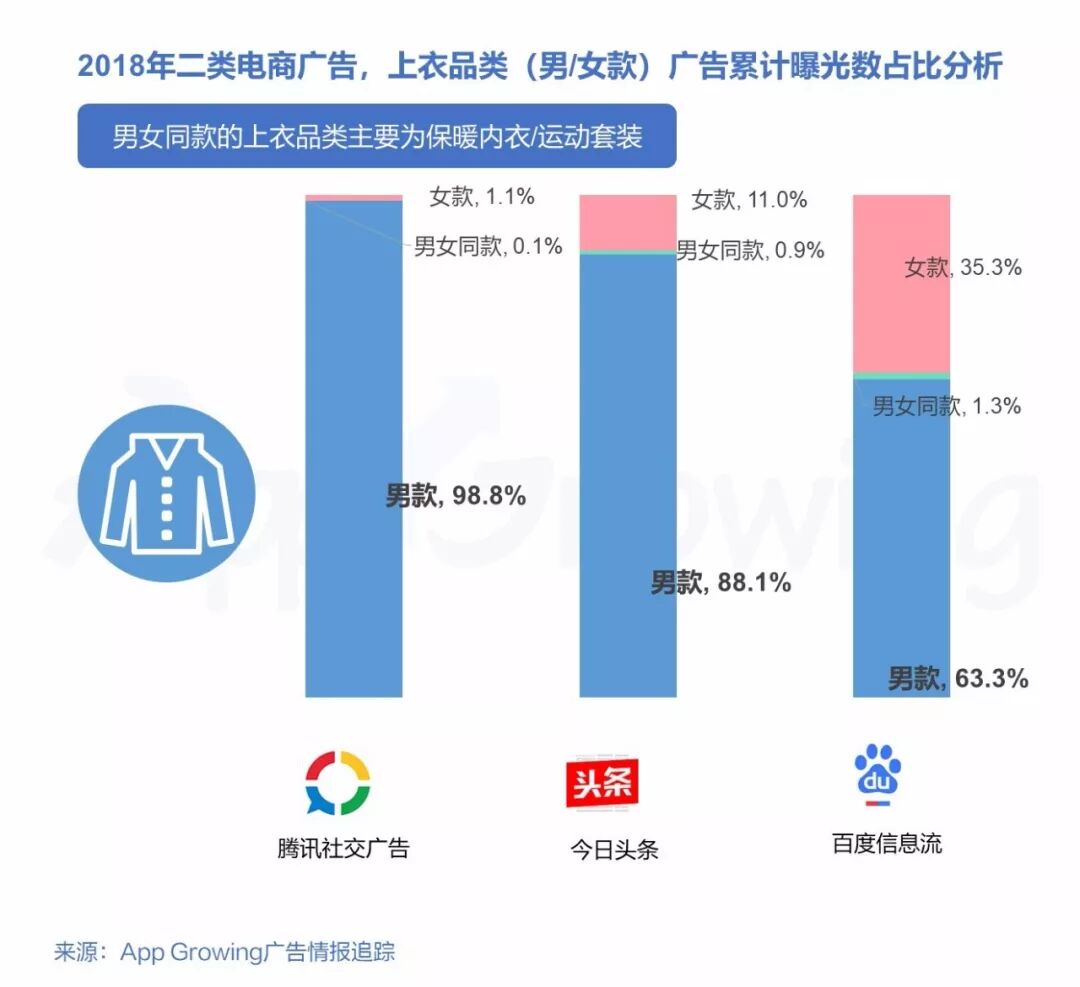 对二类电商服饰鞋包行业按照广告所属单品所使用的人群,以男款,男女通用款,女款进行细分,并通过 App Growing 的算法预估模型预估对应产品广告的累计曝光量,对二类电商服饰鞋包行业各细分项分析如下图。二类电商的上衣品类广告,在腾讯社交广告,今日头条,百度信息流广告平台上均以男款为主。其中二类电商广告中,腾讯社交广告男款上衣的累计曝光量占该广告平台的上衣类的98.8%。