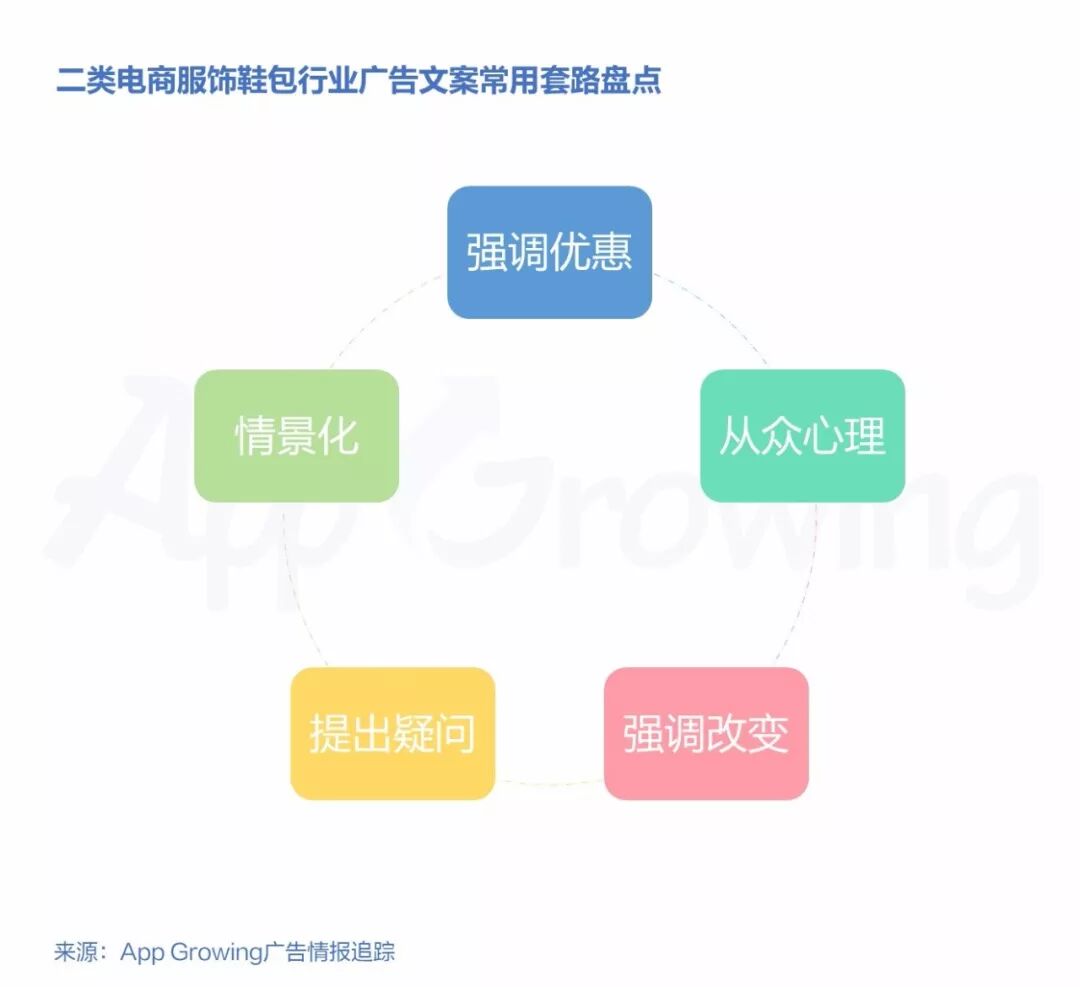 基于对二类电商服饰鞋包行业广告的文案深度分析,App Growing发现强调优惠,强调改变,提出疑问,情景化这几种文案套路较为常见。