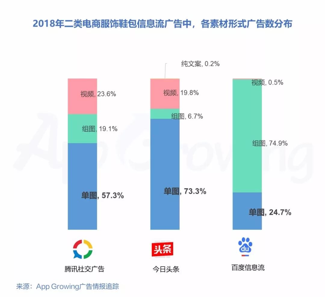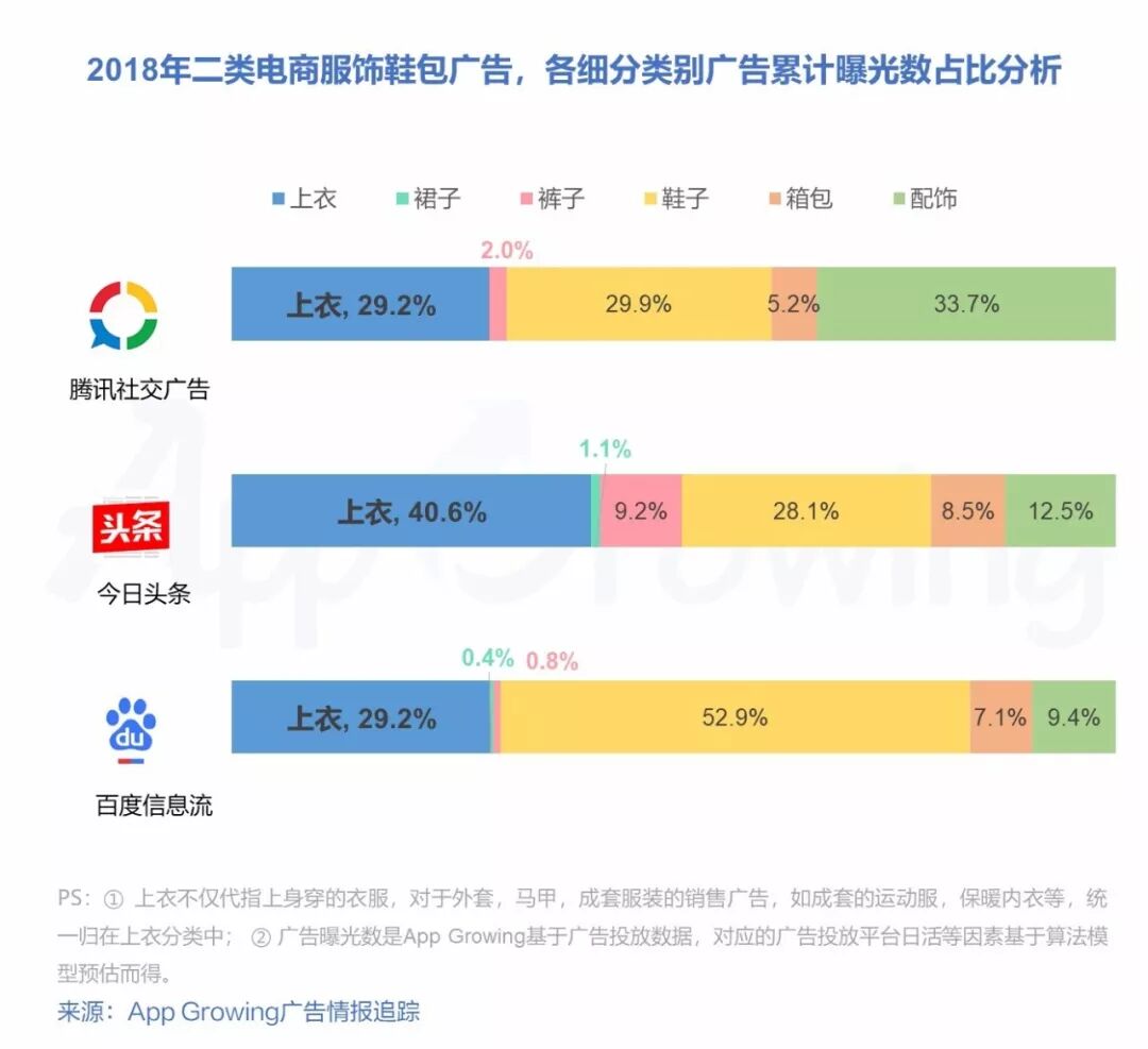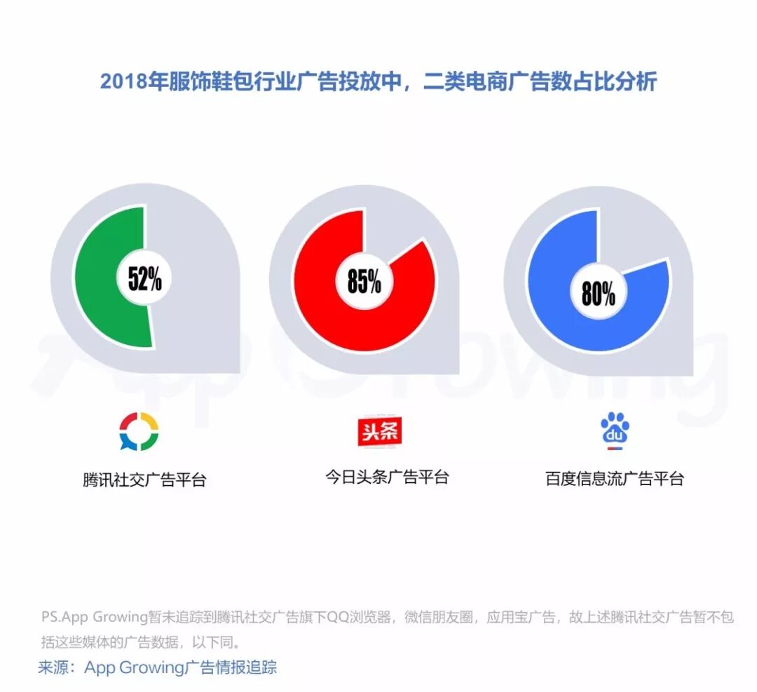 腾讯社交广告,今日头条,百度信息流广告平台中,二类电商类广告投放数在各平台整体服饰鞋包行业的广告数量占比均超过50%。
