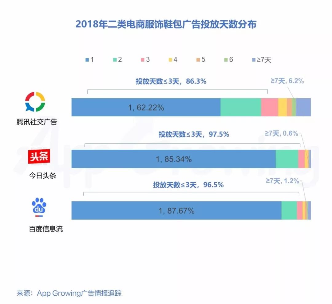 对腾讯社交广告,今日头条,百度信息流广告平台二类电商服饰鞋包行业广告分析, 其中80%以上的广告投放周期少于3天,广告投放更新频率较为频繁。