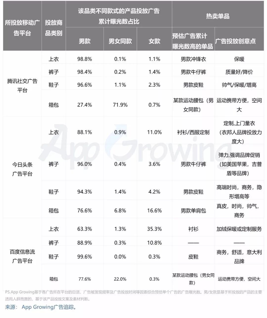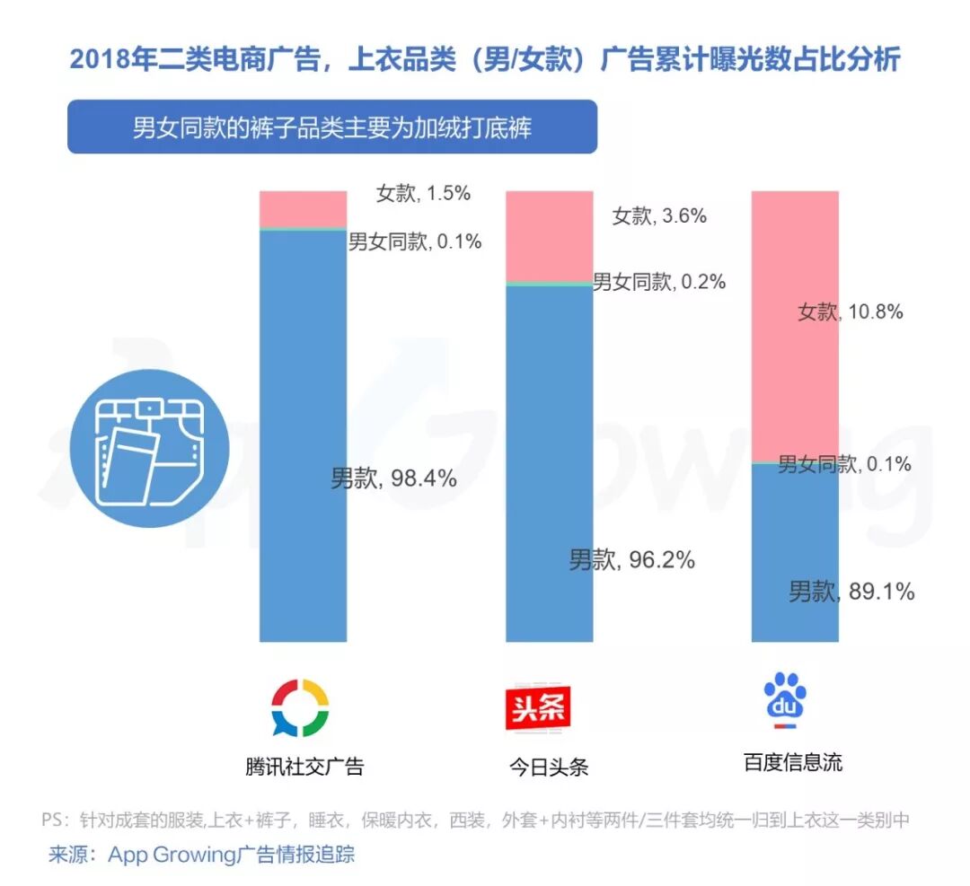 ② 服饰鞋包各细分品类的广告投放趋势洞察:上衣,裤子,鞋子这些品类的二类电商广告中,腾讯社交广告,今日头条,百度信息流广告平台男款的产品广告均以男款产品推广为主;各平台热推单品盘点,男款冲锋衣为腾讯社交广告上衣品类热推的单品。