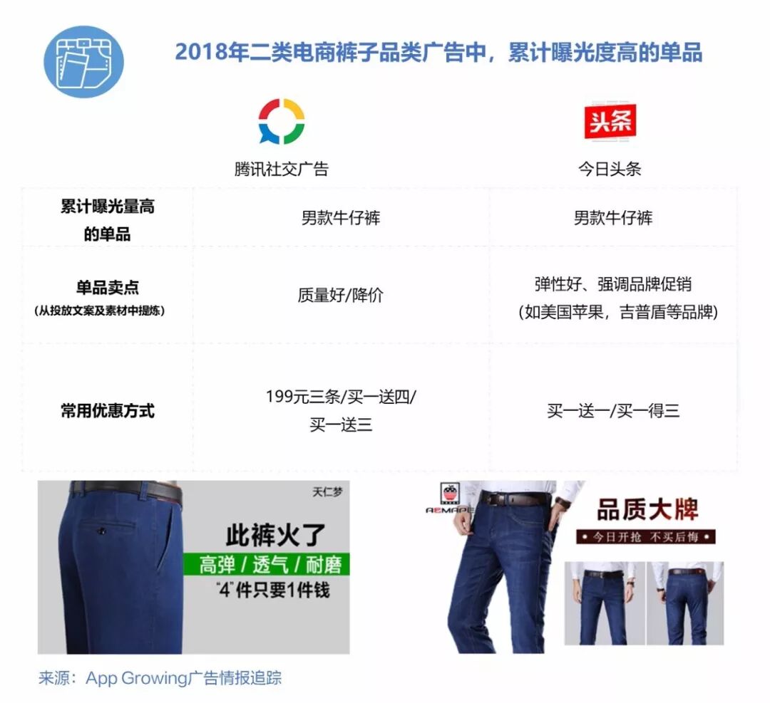在腾讯社交广告,今日头条广告平台累计曝光量较高的为男款牛仔裤,该单品在广告投放创意中主要以弹性好,强调品牌,促销活动等卖点为主,促销方式则主要为买一送X,199元3条等。.
