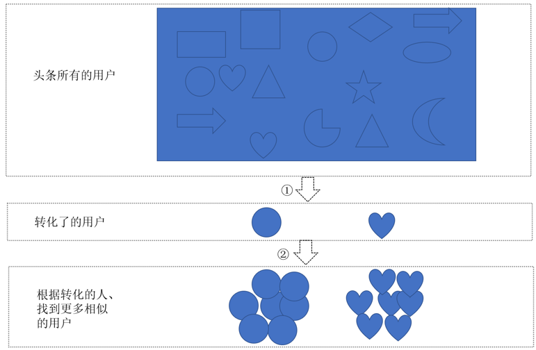 有了转化的人之后,就要去分析他们,这就进入到了第二阶段(图中②的步骤)。媒体推测那些转化了的人应该是比较喜欢这条广告的,那其他圆形和心形的用户是不是也会比较喜欢这条广告?我们给更多圆形和心形的用户展示这条广告,系统形成了一个找人的“模型”,这就是机器学习的原理。先找到一部分转化了的人,然后分析他们的特征,建立模型,再根据模型去找到和他们相似的人。