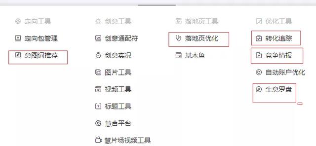 这些是我们要用到的基本工具:意图词推荐能找到更适合我们的关键词,落地页优化,能直观的判断我们的网站打开速度(移动时代网站打开速度对于广告效果影响很大)。转化跟踪是添加转化跟踪代码的,不正确就统计不到数据。竞争情报,这个能让你知道在竞争中处在一个什么水平,给自己反馈是不是要继续优化或者保持稳定现状。