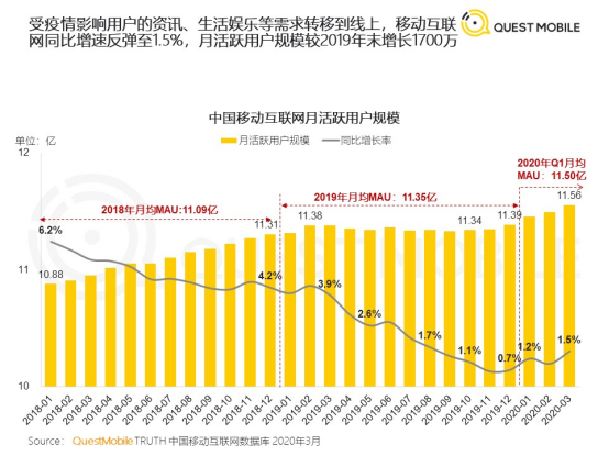 在线下商业场景遇挫的同时,硬币的另一面,很多资讯、生活、娱乐需求转移线上。Quest Mobile的2020年春季报告显示,第一季度移动互联网用户规模同比增速从19年底的0.7%反弹至1.5%,较2019年末增长1700万,而2019年中国移动互联网月活用户净增仅为299万。