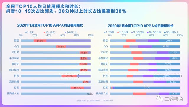 抖音DAU超4亿,较去年同期的2.5亿,增长了60%。抖音与头条的重合度为32.1%,重合用户占抖音的42.2%。抖音与西瓜的重合度为24.6%,重合用户占抖音的29.5%。抖音10-19次占比领先,30分钟以上时长占比提高到38%。