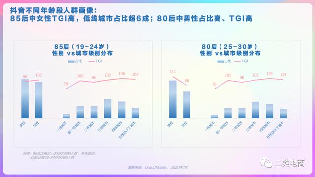 抖音高低线城市人群画像,高线城市中19-30岁的用户偏好度高,低线城市中19-35岁用户偏好度高。抖音不同年龄段人群画像,95后中男性占比略高、且TGI高;90后中女性TGI高。抖音不同年龄段人群画像,85后中女性TGI高,低线城市占比超6成;80后中男性占比高、TGI高。