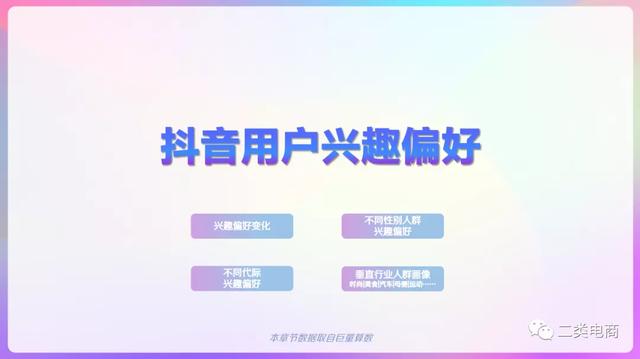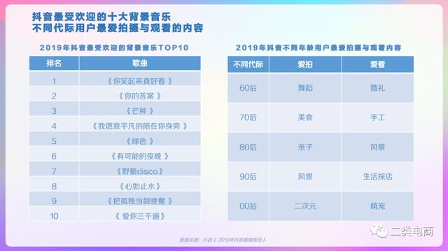 抖音用户偏好视频类型,演绎、生活、美食类视频播放量较高,观看情感、文化、影视类视频增长较快。男性用户对军事、游戏、汽车偏好度较高,女性用户对美妆、母婴、穿搭偏好度高。00后对游戏、电子产品、时尚穿搭类视频偏好度高。95后对游戏、电子产品、穿搭类视频偏好度高。90后对影视、母婴、美食类视频偏好度高。80后对汽车、母婴、美食类视频偏好度高。