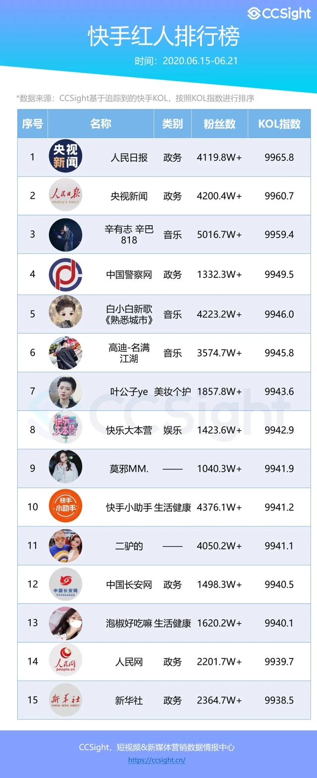 KOL指数作为排序依据,整理出快手红人排行榜,希望为广告主挑选出有潜力的KOL红人。