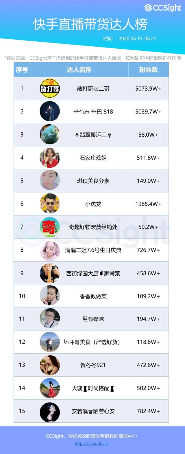 周直播销售额作为排序依据,整理出快手直播带货达人榜,希望为广告主挑选出有潜力的带货达人。