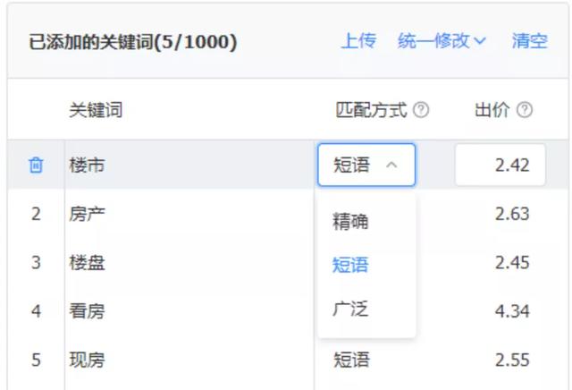 搜索广告支持精确匹配、短语匹配和广泛匹配三种匹配方式,推荐短语+广泛匹配,覆盖流量更多