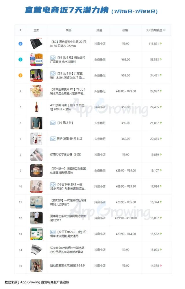 其中近7天直营电商一周潜力榜、优质榜和爆品榜如下: